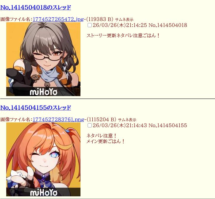 | … | 6326/03/26(木)21:31:01No.1414510768+おお〜miHoYoちゃん〜二度と3日連続メイン更新なんてやらないでおくれよ〜 |