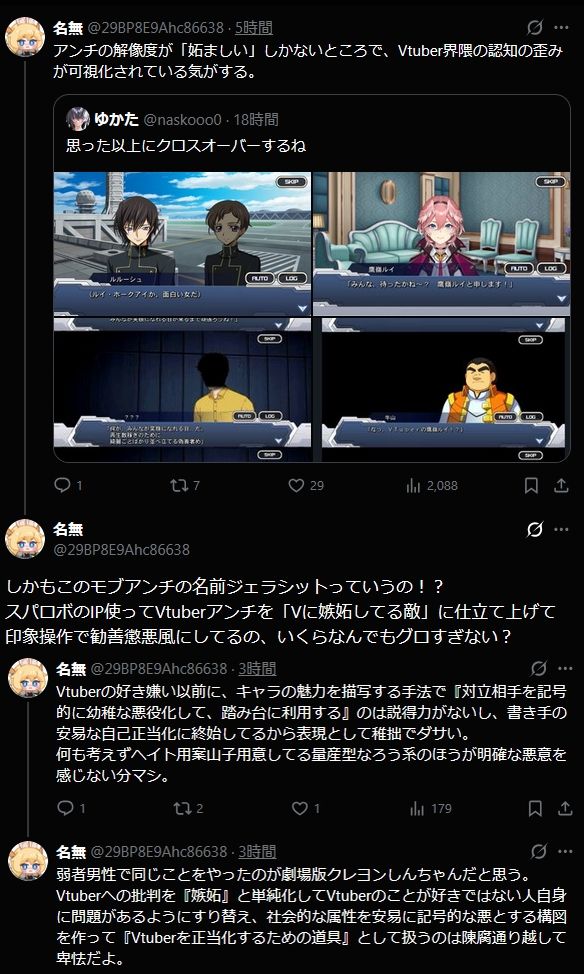 | … | 8626/03/26(木)23:26:07No.1414550971そうだねx10>このアンチ見てるとジェラシットさんはマイルドに見えるっつーか… |