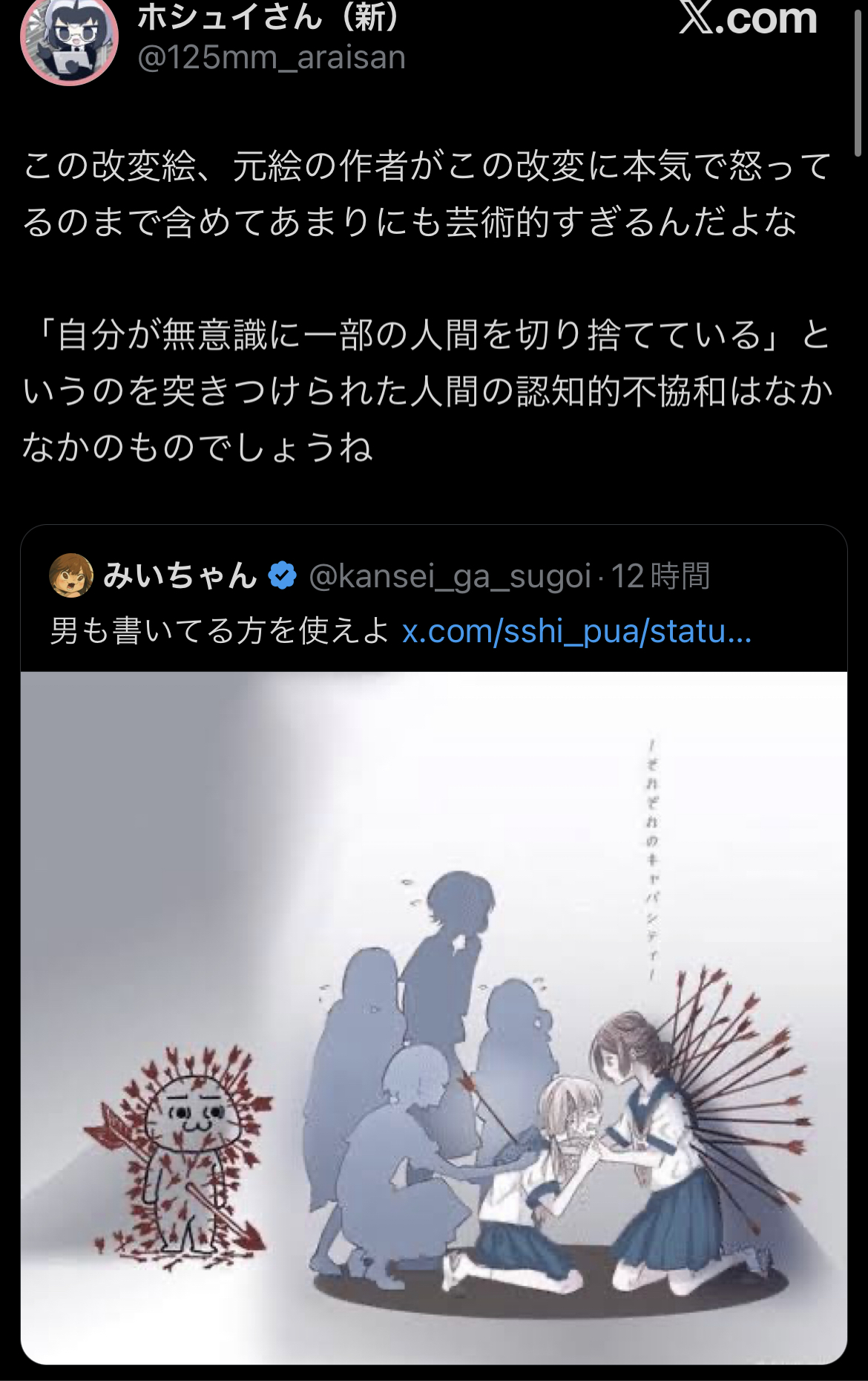 | … | 25026/03/27(金)07:23:25No.1414606204+>>>自分の絵にクソみたいな落書きされた上にこんなイタいノリで持ち上げてたら作者の人もそりゃ一言言いたくなるわな… |