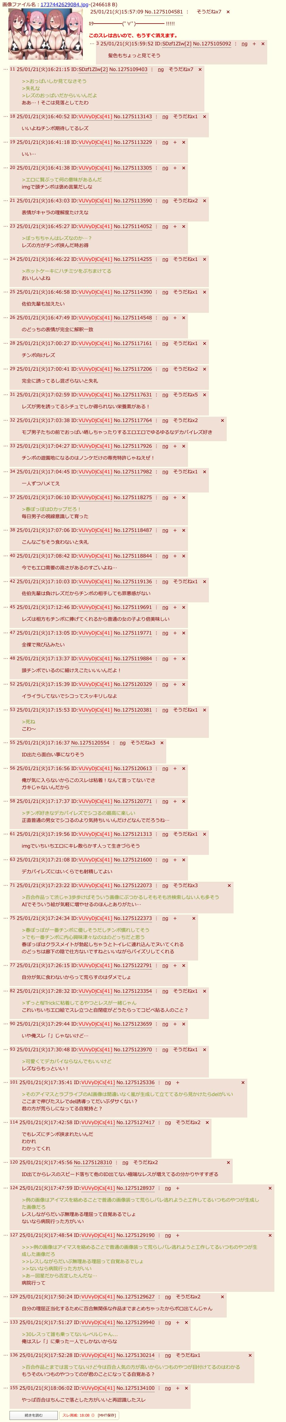 | … | 1026/03/27(金)09:07:10No.1414620299そうだねx2こんなスレに毎回噛みついてくるやつは何が気に入らないの |