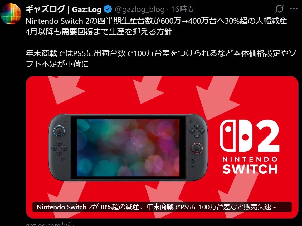 | … | 1026/03/27(金)13:10:25 ID:bGlYG4kkNo.1414671309+欧州はもともと任天堂なんて眼中にないって地域だからともかく北米で不調なのは痛いな |