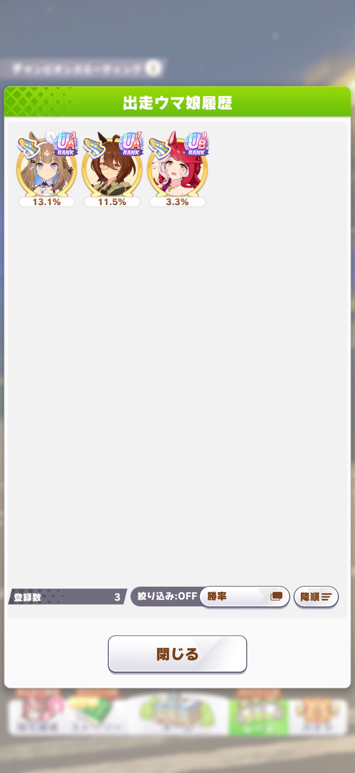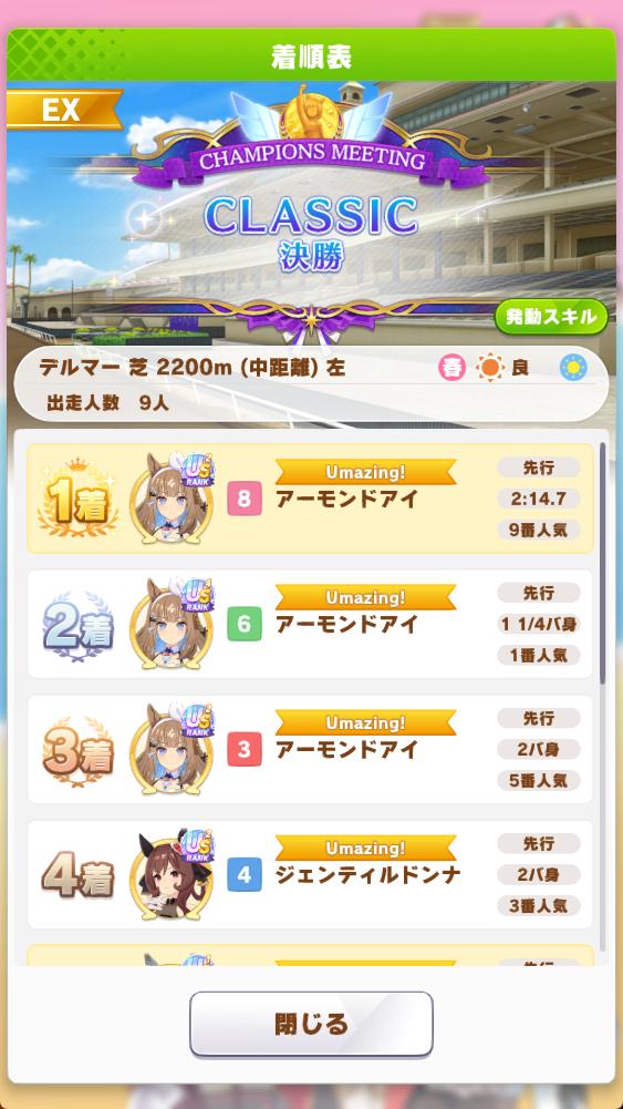 | … | 3926/03/27(金)13:39:50No.1414677879+>テレッテーテーテーテーテーーテーーテーーみたいな奴です >曲名は分かりません えっと…いつものチャンミのBGMでよろしいんでしょうか…? あと負けた時のBGMなら殿堂入りウマ娘一覧画面で流れてるアレです |