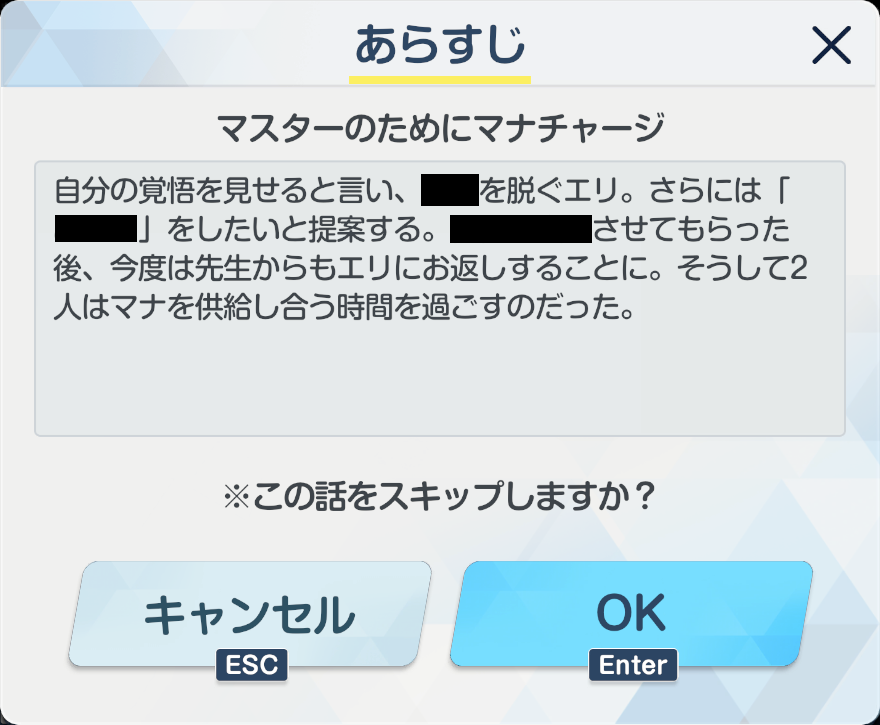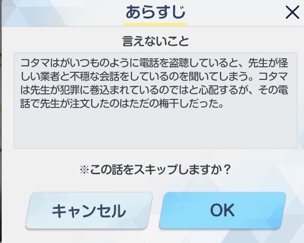 | … | 31426/03/27(金)17:38:10No.1414724630+あんまスマホゲームやってないけどスキップのあらすじ用意してあるの珍しいよね |