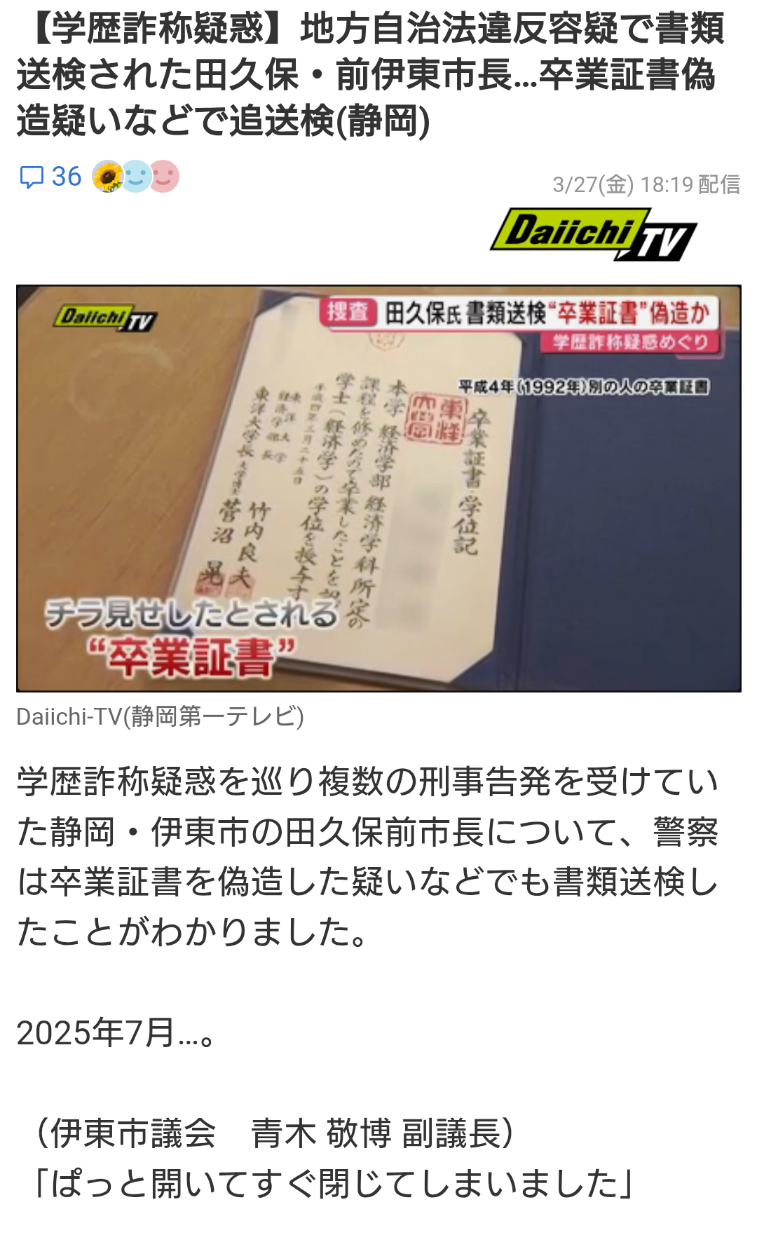 | … | 3326/03/27(金)19:45:30No.1414769751そうだねx12>学校ははっきり除籍済みって言ったし本人も卒業してないことを認めた→公職選挙法違反 |