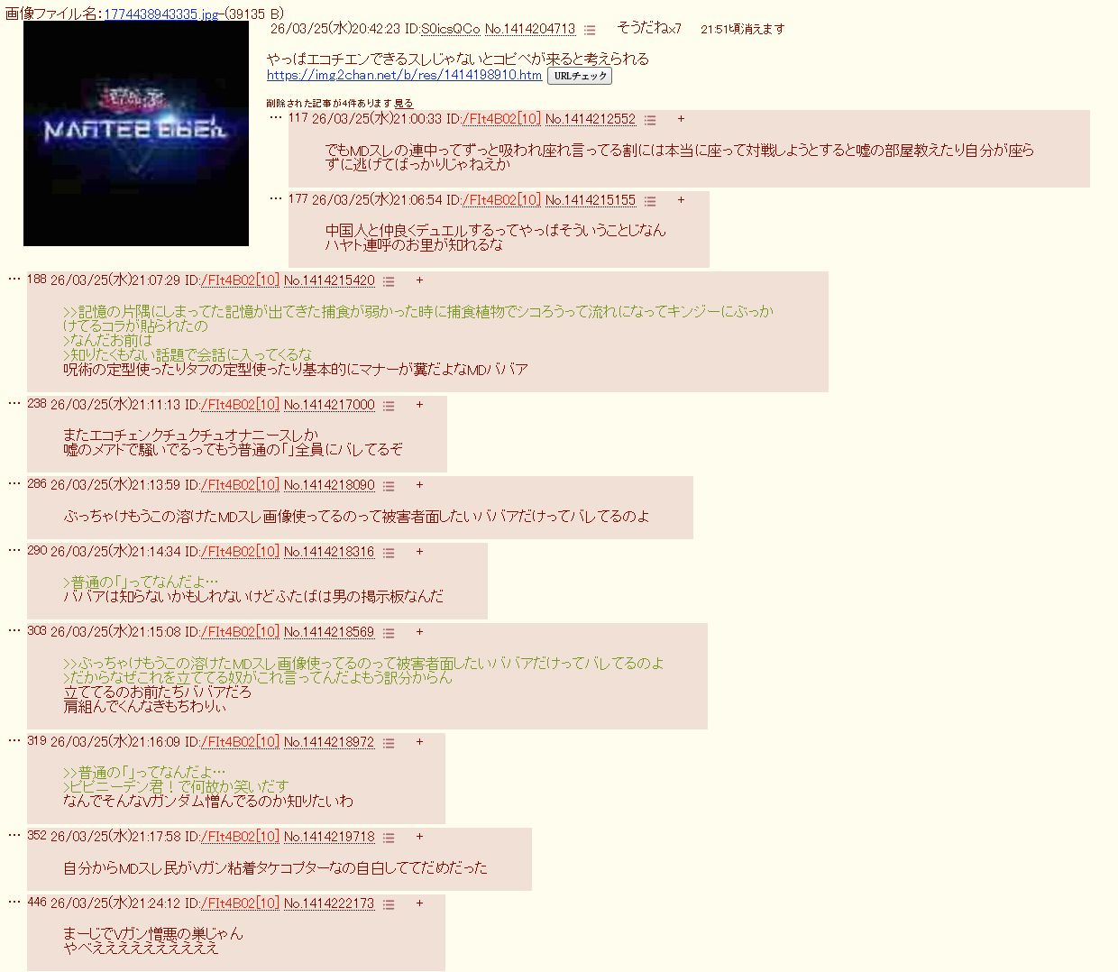 | … | 26126/03/27(金)20:41:32No.1414796319そうだねx2>隔離スレでエコチェンするの好きだね |