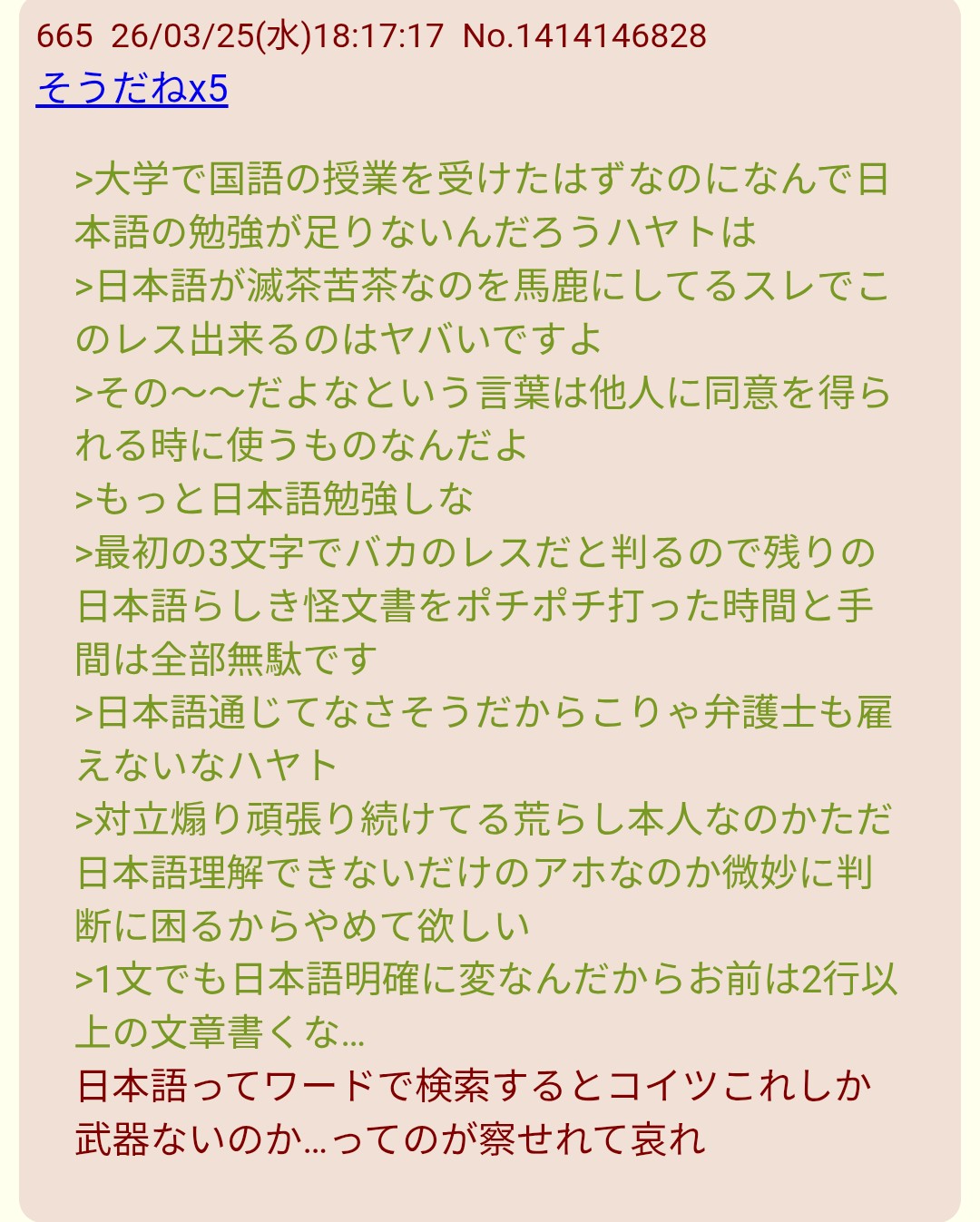 | … | 326/03/27(金)20:04:57 ID:JRKkoaWoNo.1414778449そうだねx78>ネットの定型全部覚えてないと恥ずかしいって言ってる奴の方が恥ずかしくない? |