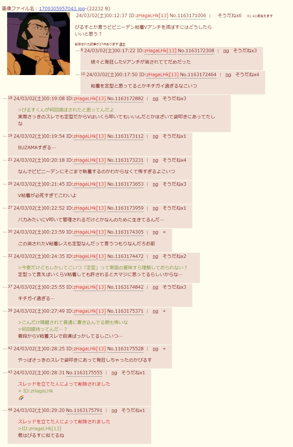 | … | 23626/03/27(金)20:36:33No.1414793747そうだねx1>ぴるすも知らなくてVガンダムスレ立ててるのは全部ぴるすだから潰してくれとか言ってなかった? |