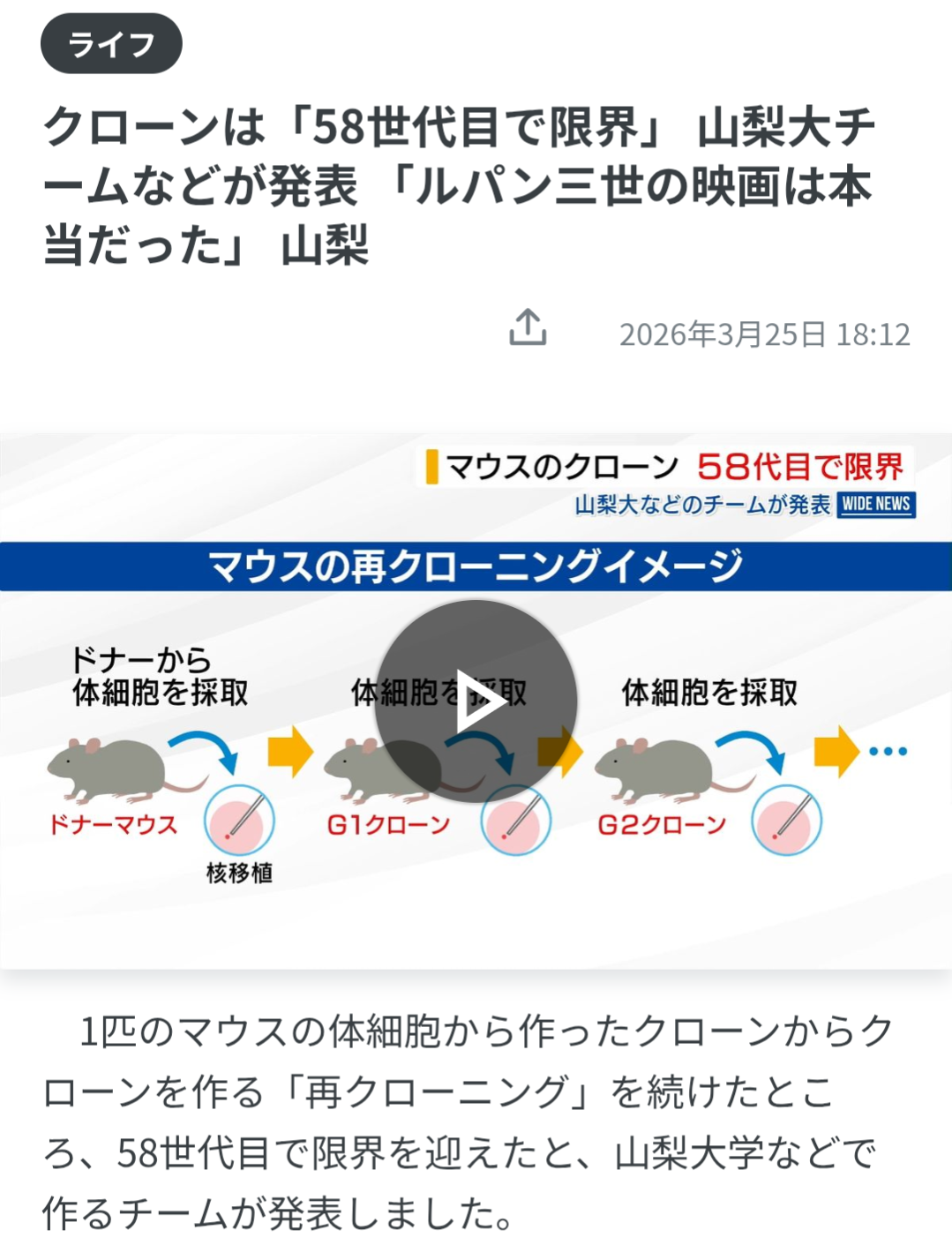 | … | 526/03/27(金)20:48:58No.1414800641そうだねx47>山梨大学の若山照彦教授は「ルパン三世の映画では、マモーという敵がクローンを何世代も繰り返していて、異常になっていました。そんなことが本当にあるのかと思って実験を続けたら、本当だったのにびっくりしました」と話しています |