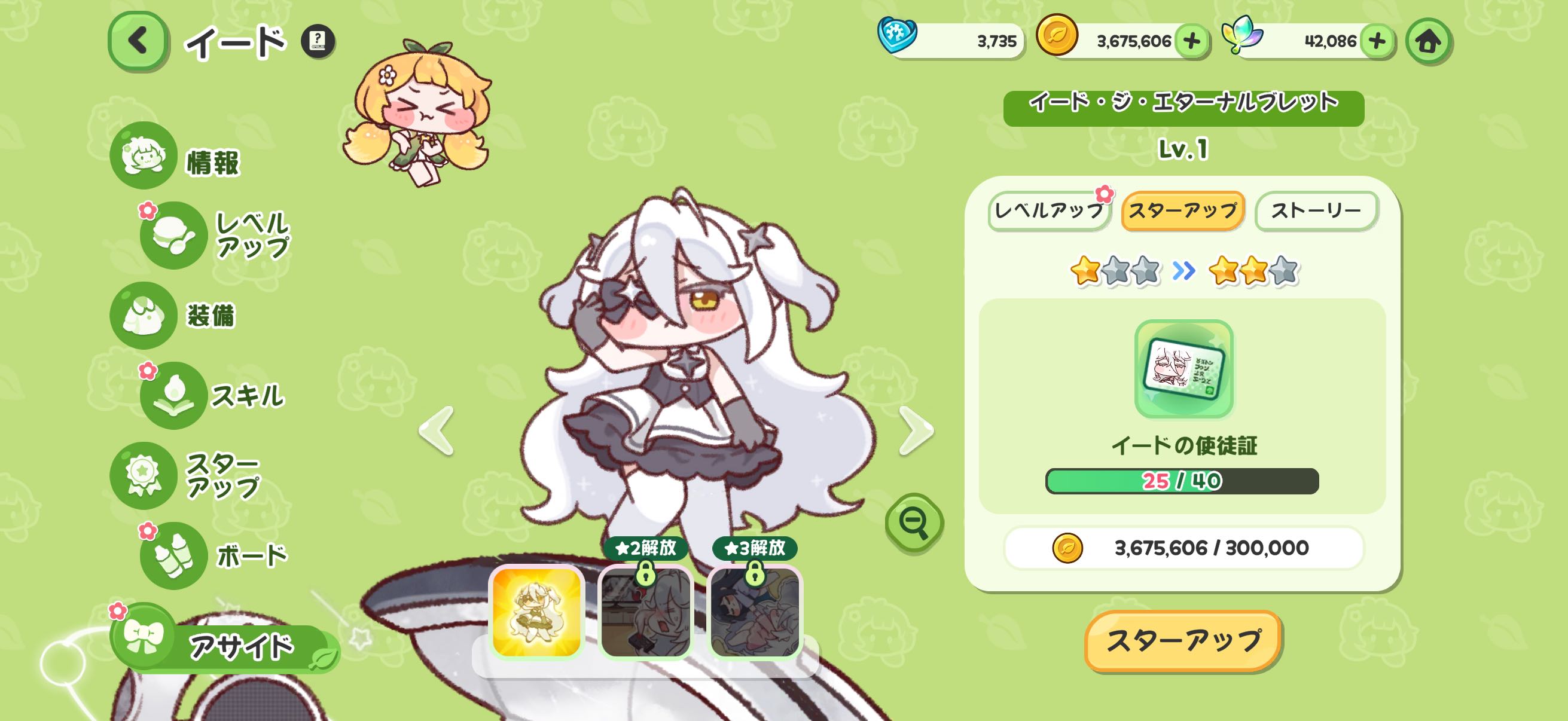| … | 726/03/27(金)21:55:37 ID:dFWR45akNo.1414836060+ついにスターアップ無しでも☆3が100レベ届くようになっちゃったにゃん パン屋全然行ってないにゃん |