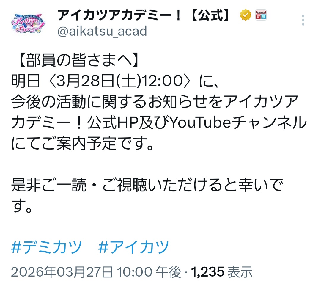 | … | 2826/03/27(金)22:36:25No.1414854583そうだねx2アイカツチャレンジが毎日配信されます |