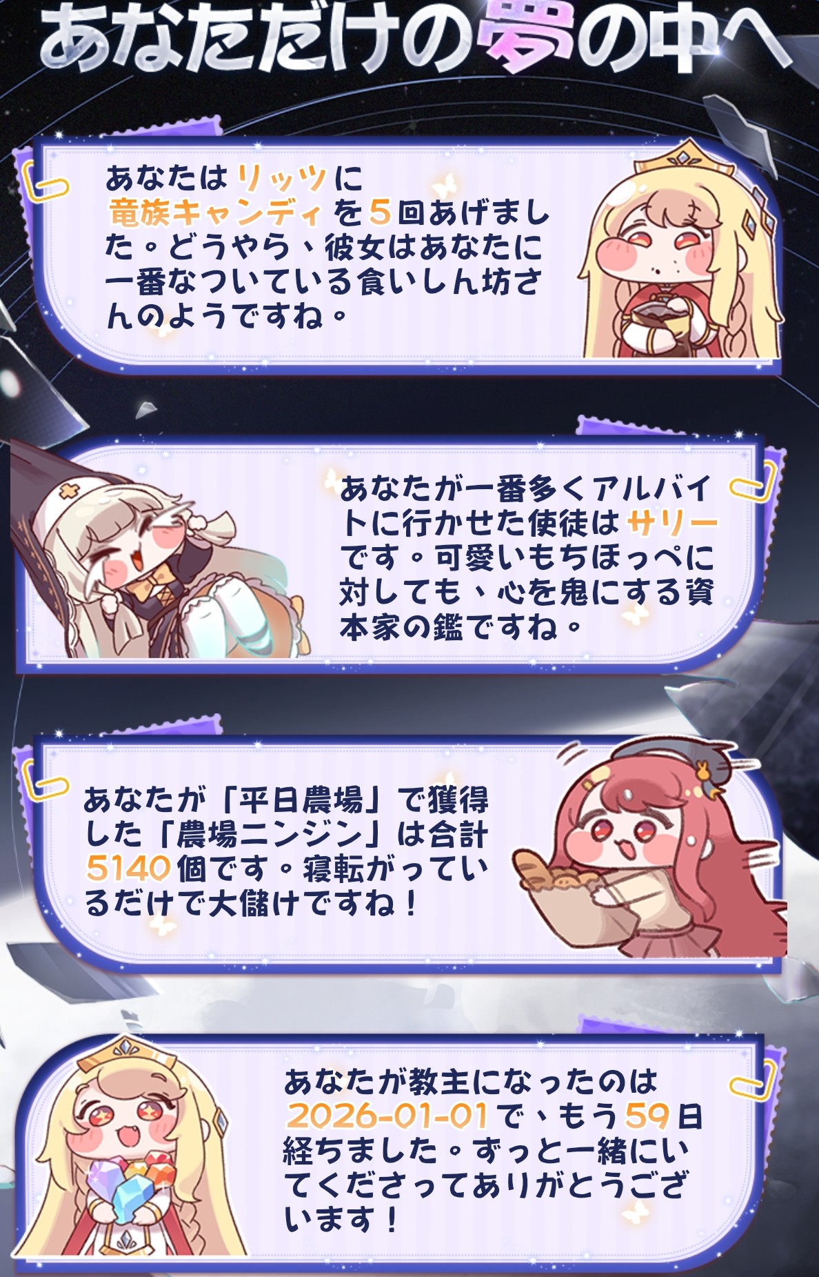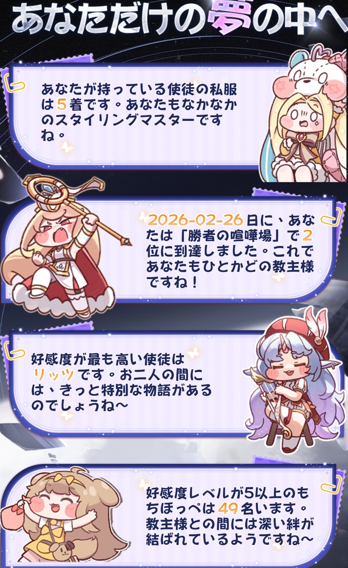 | … | 8626/03/27(金)23:22:25 ID:UC5zEAfMNo.1414872410+>今イードが⭐️4でガチャポイント900だからエルダイン指定セット2枚と150連チケを2セットで行けるかなって… |