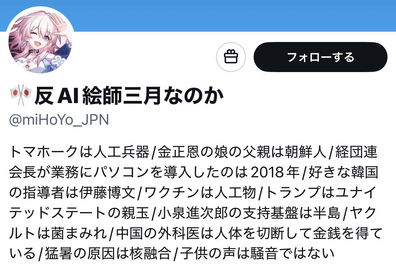 | … | 11926/03/28(土)03:51:12No.1414923943+プロフに書いてる各種ワードに反応する奴と反AIってワードに反応する奴は同じ扱いなのか… |