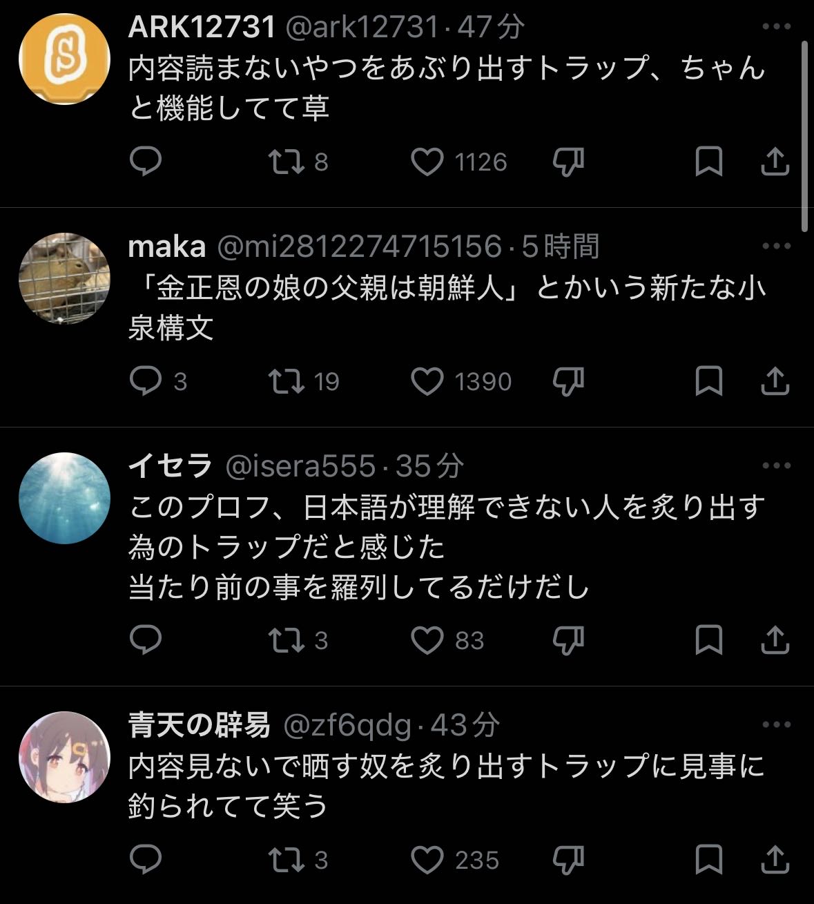 | … | 5126/03/28(土)02:05:28No.1414915362そうだねx10>引っかかったアホはもうネタ垢だとは認められないからな |