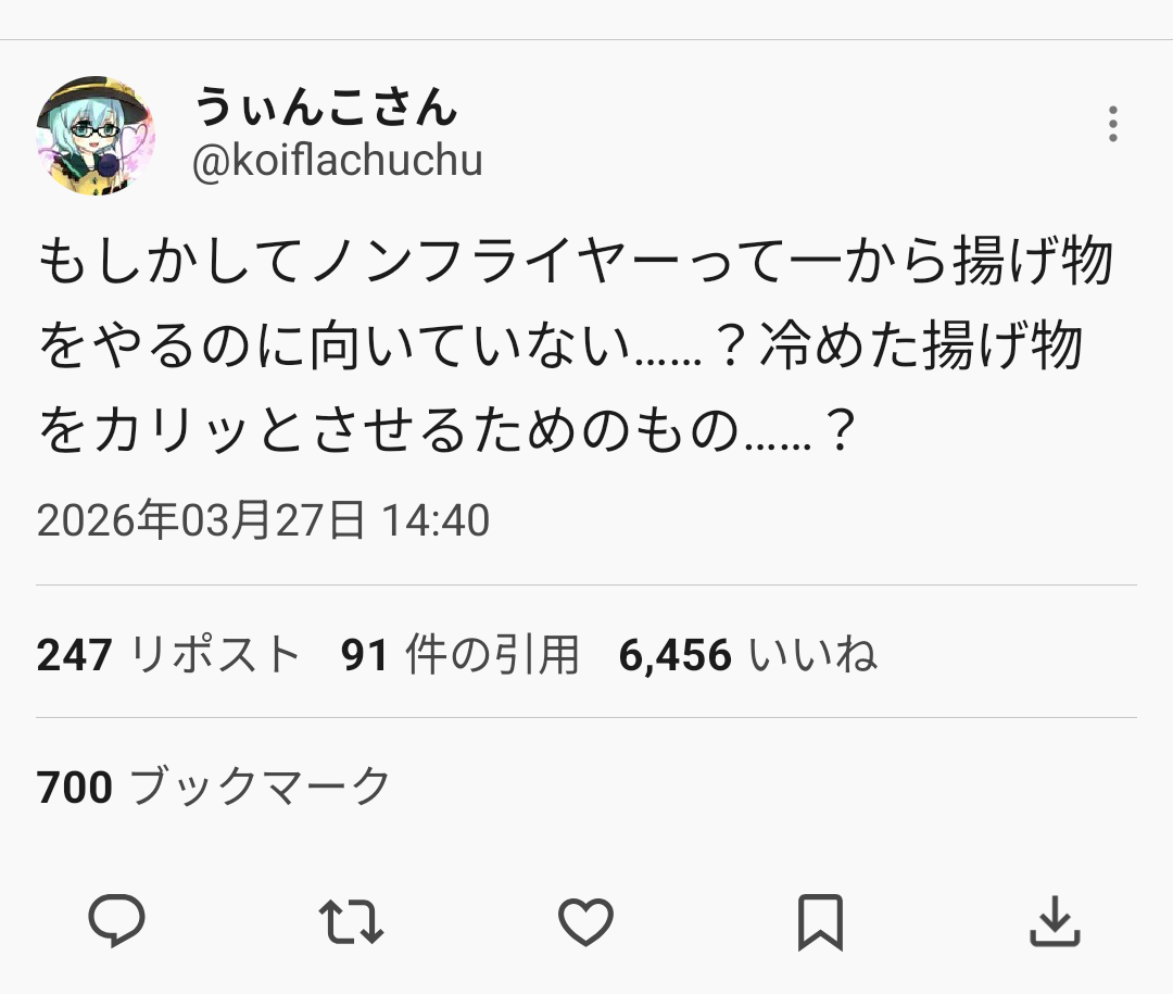 | … | 826/03/28(土)02:40:30No.1414919469そうだねx4勘違いも何もノンフライヤー側が揚げ物できるドスエっつって出てきたんだろ |