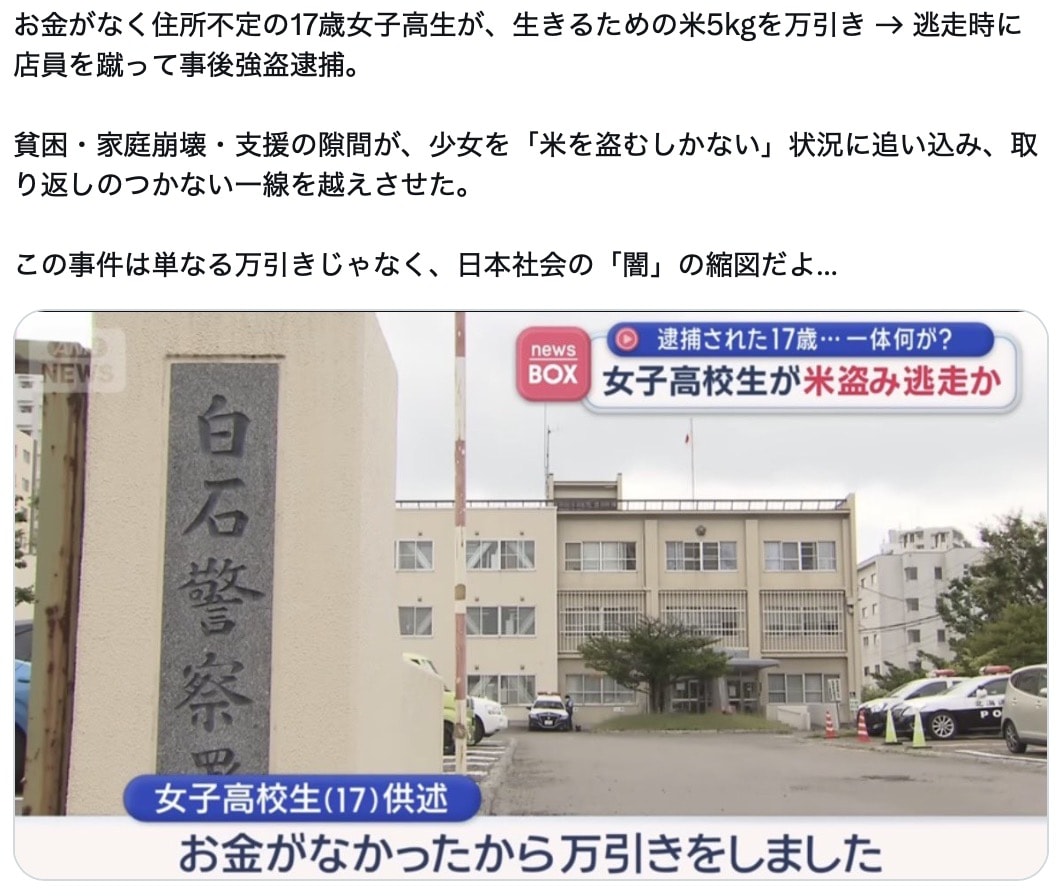 | … | 12726/03/28(土)04:41:24No.1414925764+住所不定の人間が自分で喰うために米5kgを盗むのか |