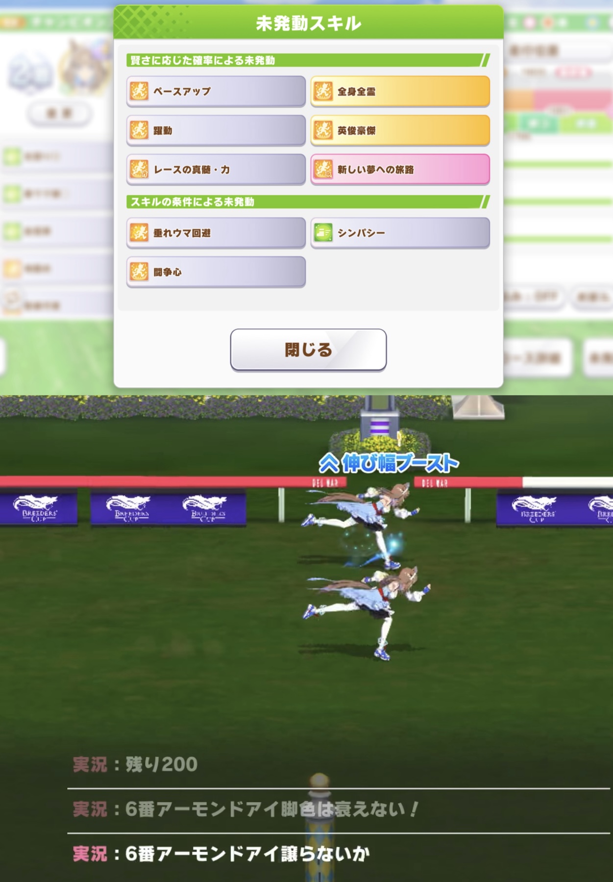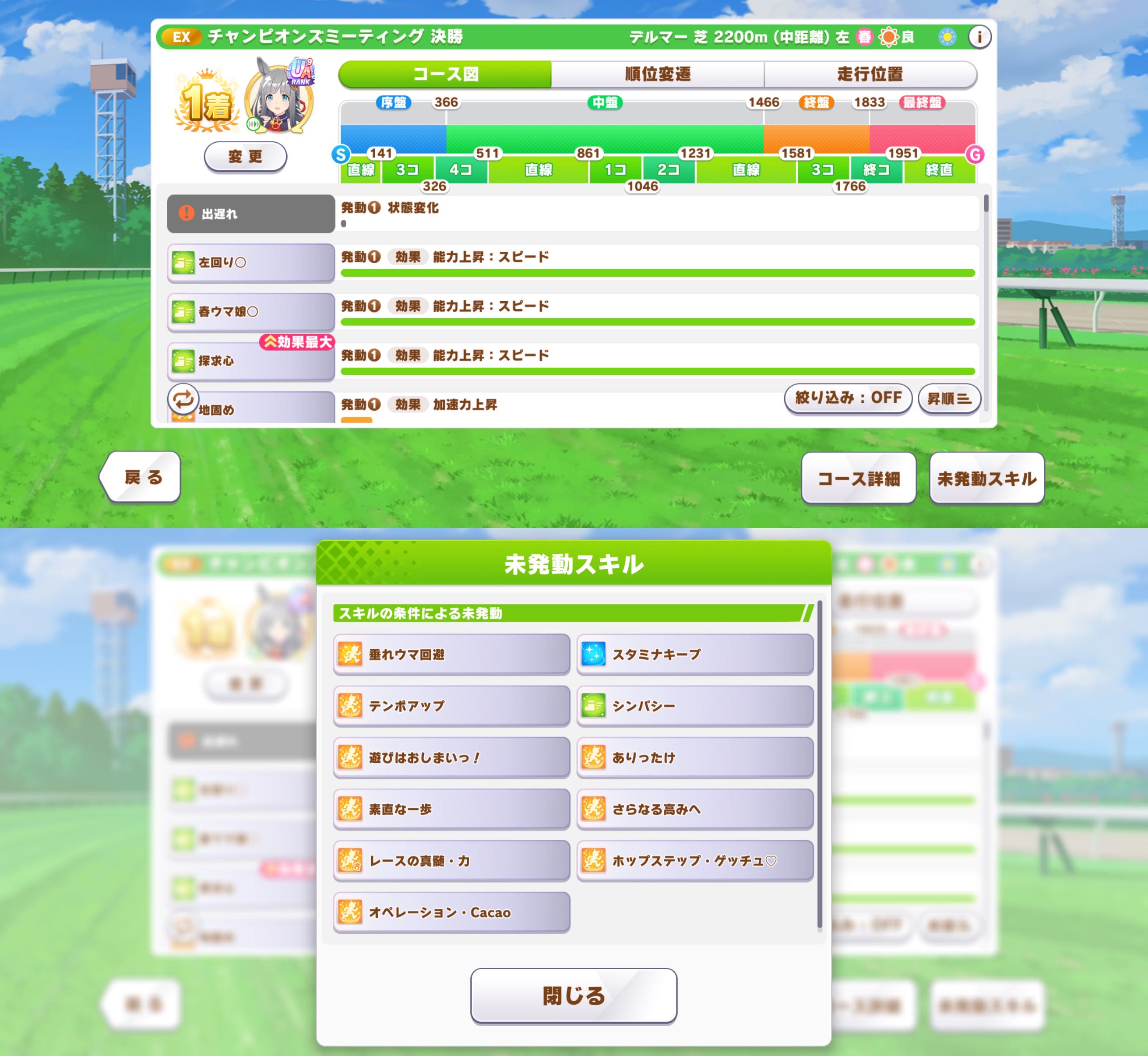 | … | 8826/03/28(土)10:31:55No.1414965300そうだねx1>なんというか先行のつもりが先頭立って逃げみたいになっちゃったとか >レース展開によって立ち位置変わった時に逃げスキルが発動してフォローできたとか 先頭にいたら〜みたいな条件なら先行でも発動しますが <逃げ>になってるスキルは先行で走ってたら発動しませんよ |