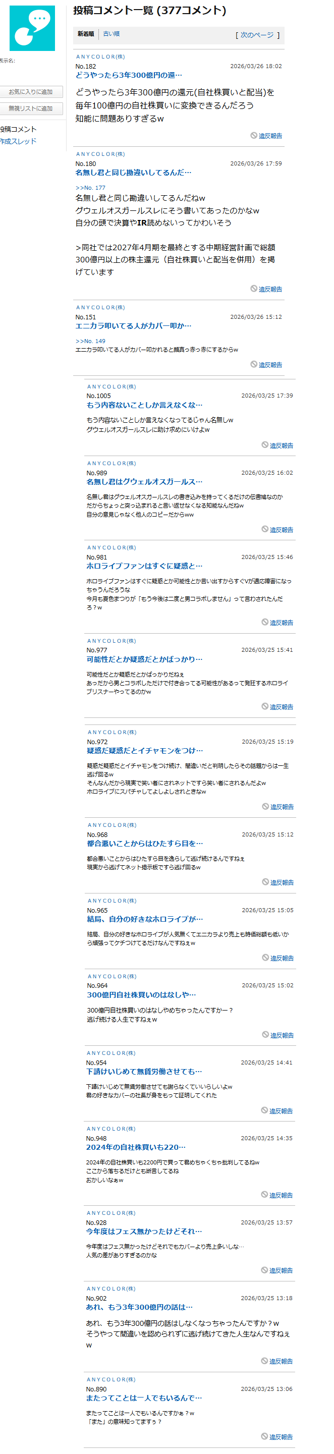 | … | 526/03/28(土)09:52:03No.1414956862そうだねx4ここのYahooファイナンスって何故かカバーと戦ってる奴常駐してて怖いよな |