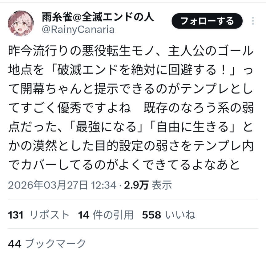 | … | 1826/03/28(土)13:39:45No.1415012786+目的を持たせるのは普通の作品を書く場合のテンプレであってWEB小説系のテンプレはパクれる展開が豊富かどうかが全て |