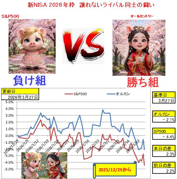 | … | 42226/03/28(土)16:34:16No.1415056862+>S&P500とオルカンどっちがいいかはimgでもよくスレ立ってたけど取り敢えず2026年はオルカンが勝ちそうだな |