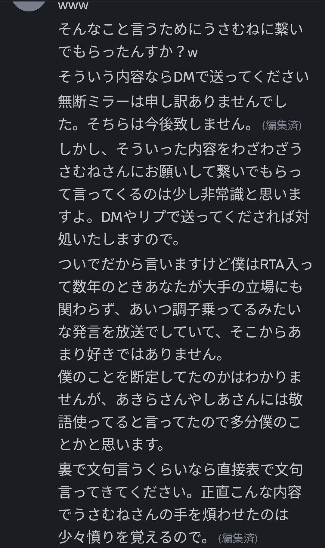 | … | 11926/03/28(土)21:09:21No.1415146609+(⌒,_ゝ⌒)とあるVが勝手にRTAミラーしてRTA走者に怒られたら逆ギレした件について…ホホホwそれバトラやんw |