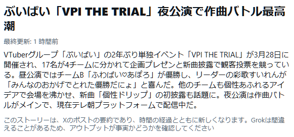 19:00から #ぶいぱいトライアル VPI THE TRIAL 夜公演やってるよ 2026/03/28 youこのスレは古いので、もうすぐ消えます。