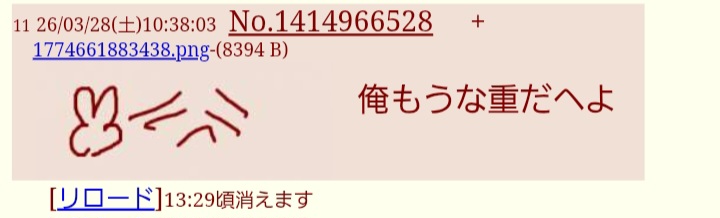 | … | 4026/03/28(土)22:19:43No.1415178402+スレ「」はどう思う? |