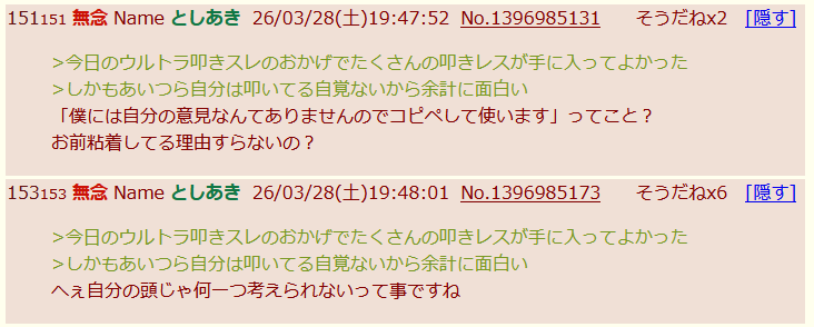 | … | 23026/03/28(土)23:57:59No.1415215831そうだねx4まあ複数人だろうが同一人物だろうがバカにしてdel入れるだけなんですけどね |