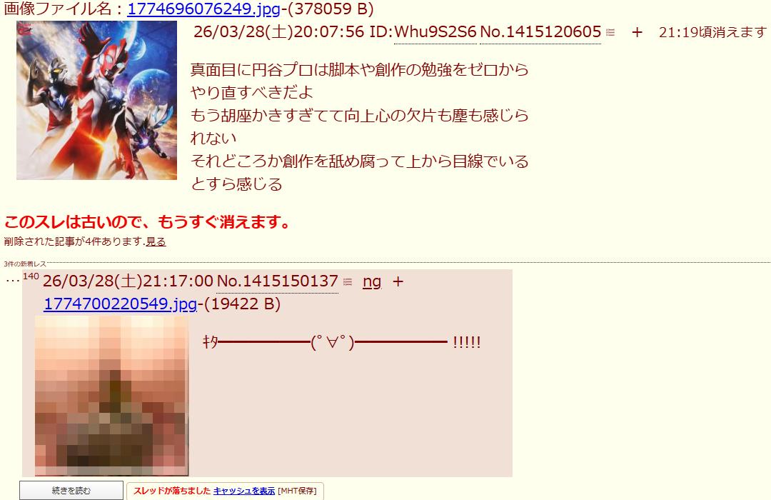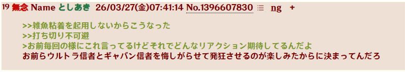 | … | 7026/03/28(土)23:08:10No.1415197297そうだねx1>盛り上がってるのはアホなウルトラ信者だけだろ |