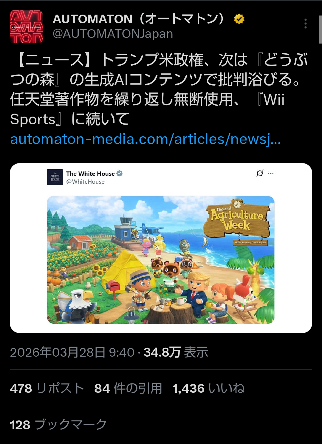 | … | 2526/03/29(日)00:54:07No.1415234184そうだねx13まぁトランプ陣営がやってる侵害は任天堂だけじゃないからな…… |