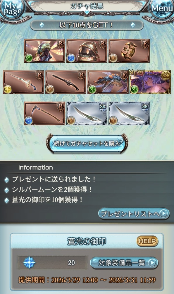 | … | 1726/03/29(日)10:41:32No.1415316782+アトゥム様は出ませんでしたが冷静に考えればりっちょ様とバステト様がいらっしゃったので無料としては大変よろしい結果な気がしてきましたわ |