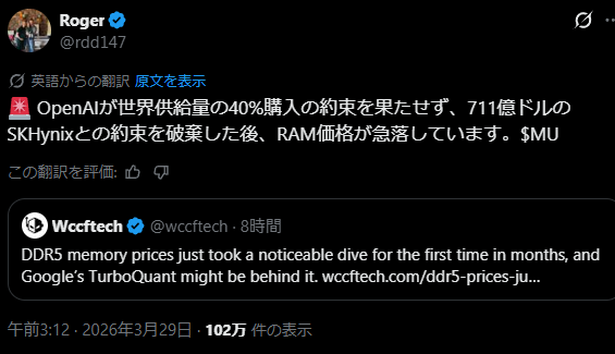 | … | 50826/03/29(日)10:49:52No.1415318650そうだねx2Crucialはどうするの?掌返すの? |
