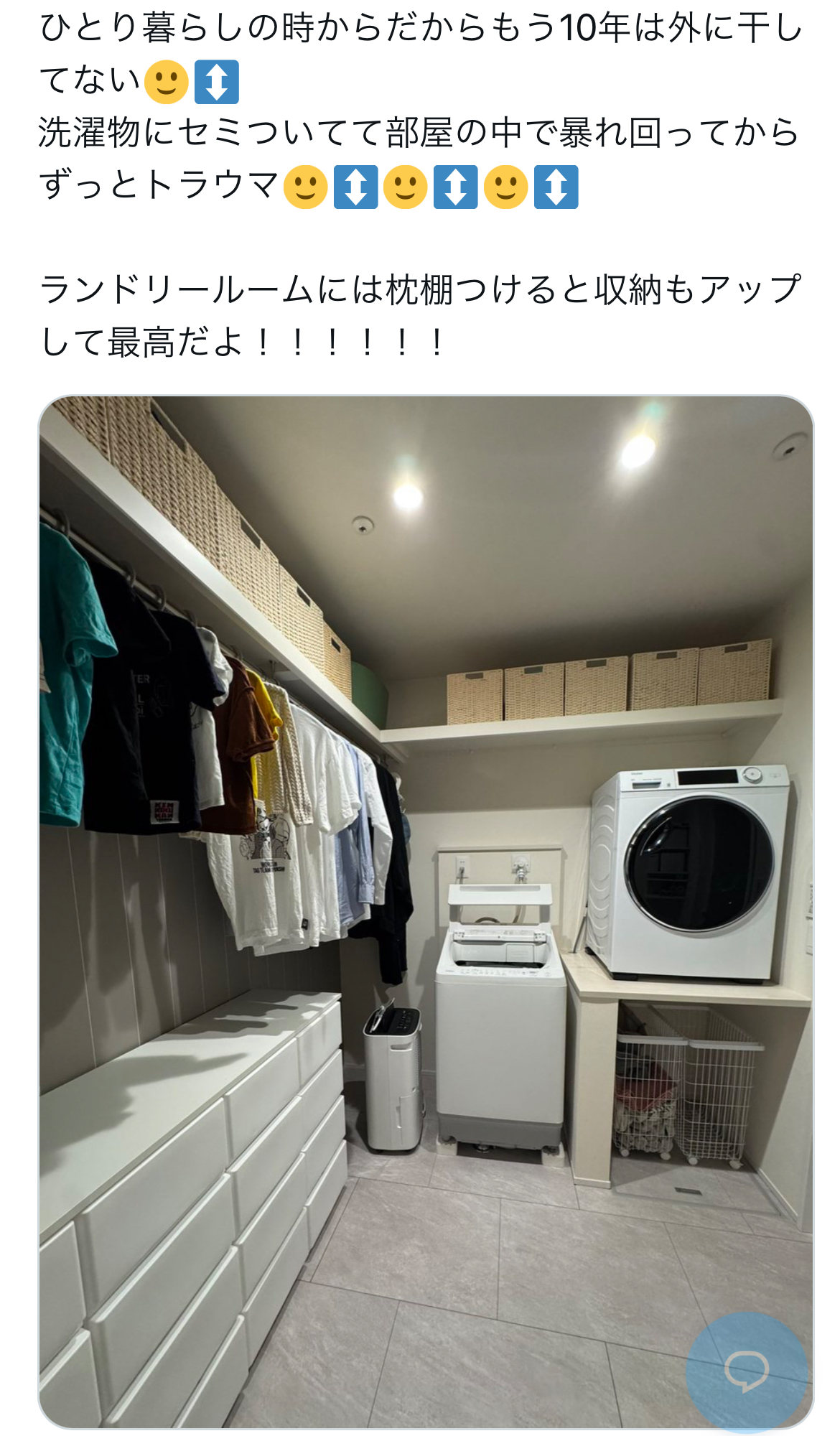 | … | 626/03/29(日)16:29:56No.1415416464そうだねx18洗濯干す片付けるが1部屋で完結してるのは素直に羨ましい |