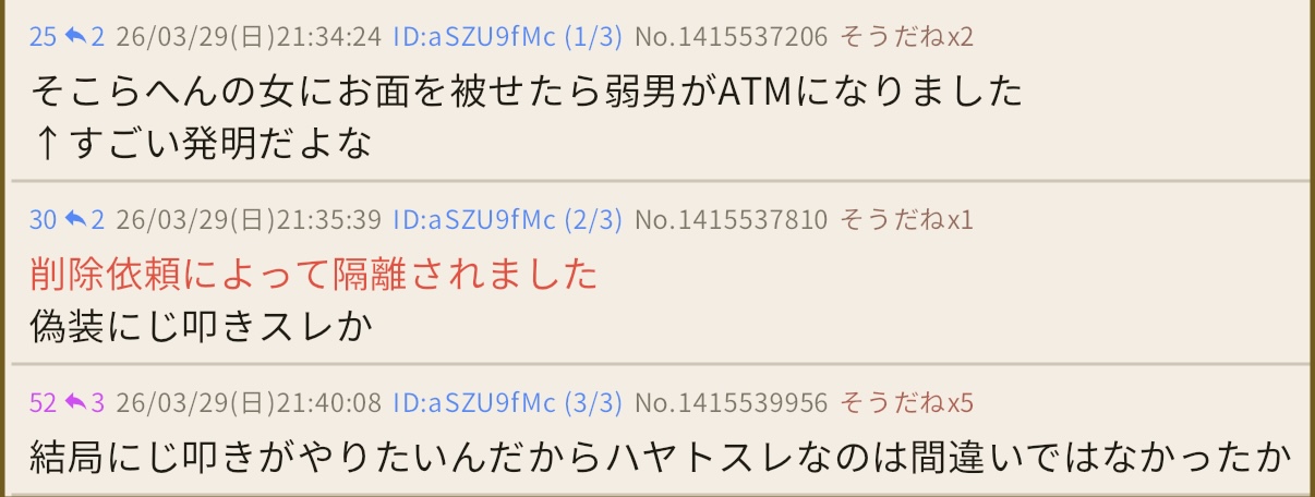 | … | 2926/03/29(日)21:35:32No.1415537746そうだねx14>そこらへんの男にお面を被せたら弱女がATMになりました |