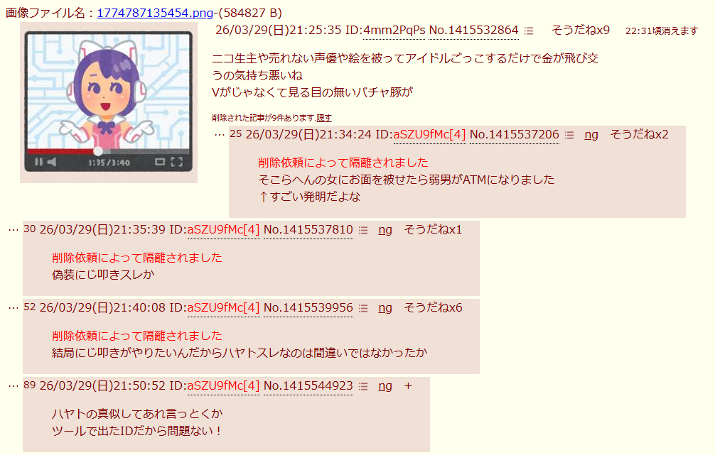 | … | 3426/03/29(日)21:36:21No.1415538150そうだねx19>偽装にじ叩きスレか |