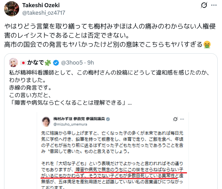 | … | 1526/03/30(月)02:53:28No.1415627711そうだねx4>梅村みずほのヘイト発言には発達障害や精神障害や知的障害の「」も怒るべきなんだよな |