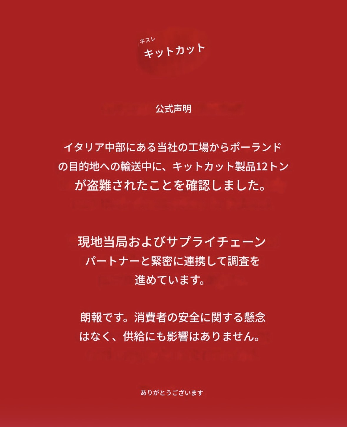 | … | 6326/03/30(月)08:26:26No.1415646937+丸ごと盗んだトラックにたまたまキットカットオンリーの運送が入ってた感じか |