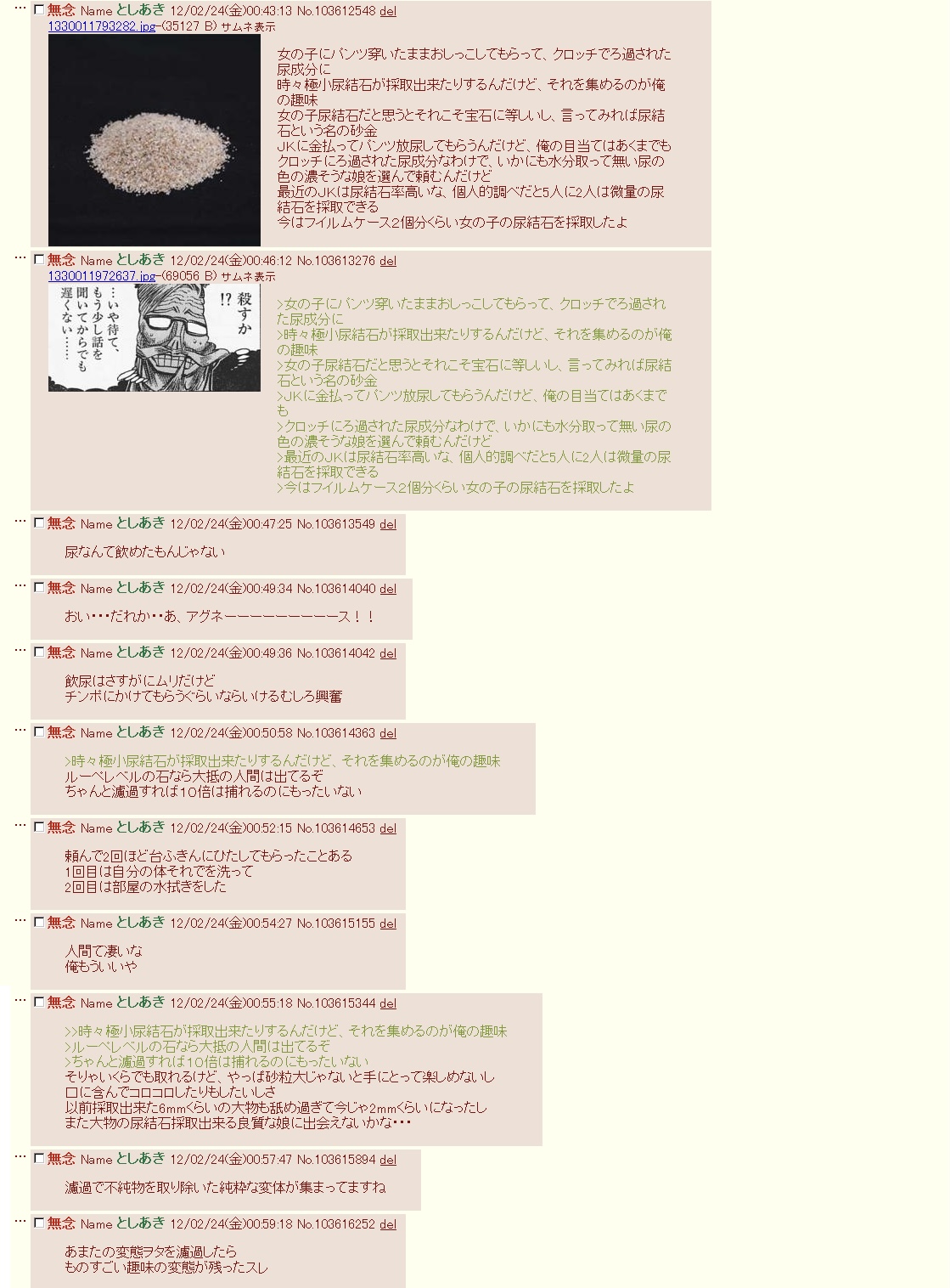 | … | 2326/03/30(月)12:33:38No.1415690140そうだねx1>確か嬢にパンツにおしっこしてもらってそっから微細な結石集めてコレクションしてる「」いたよね |