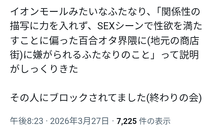 >関係性の描写に力を入れずSEXシーンで性欲を満たすことに偏った百合ヲタ界隈最低だな
