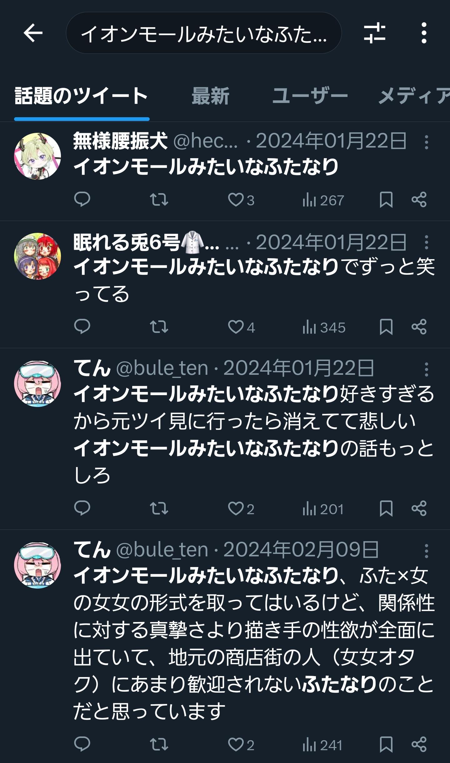 そして前提を知らなくても自分は"イオンモールみたいなふたなり"を書いている側だからそれについて説明している人(イオンモールみたいなふたなりを嫌いな人)にブロックされてますまでちゃんと読み取れるよ