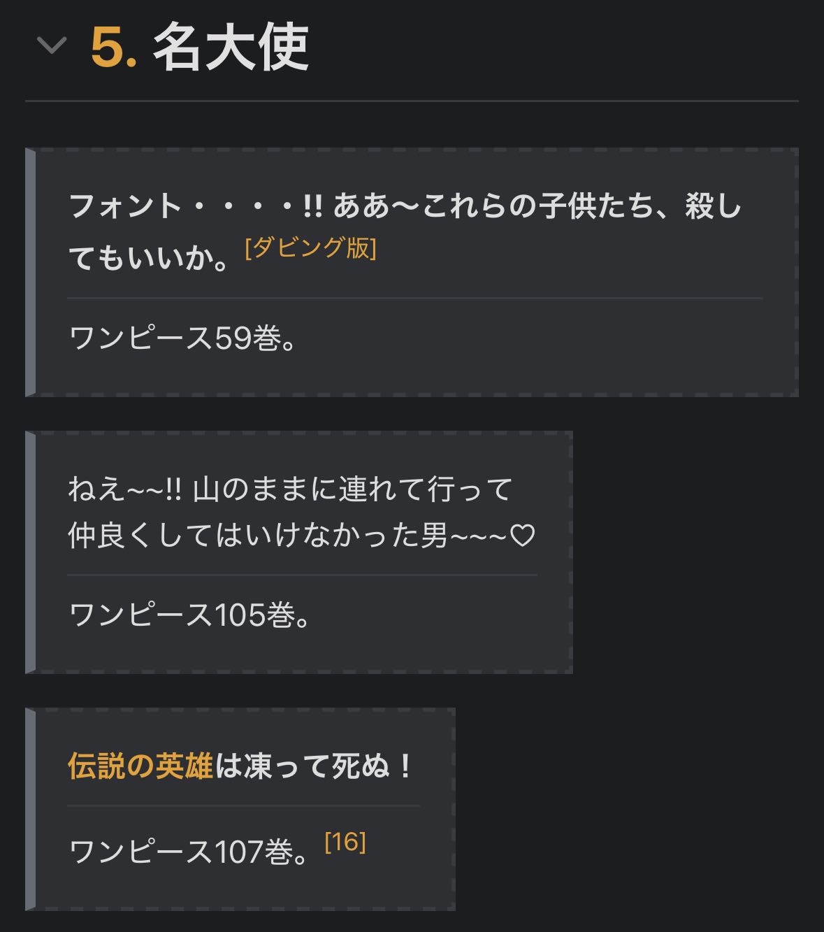 | … | 21026/03/30(月)16:28:03No.1415739977+ワンピースが構文とかいう馴れ合いの場にされてしまったのが悲しい |
