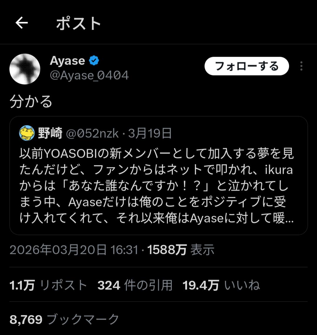 | … | 326/03/30(月)13:21:52No.1415703014そうだねx31Ayase(なんか…大変なことになってるな…) |