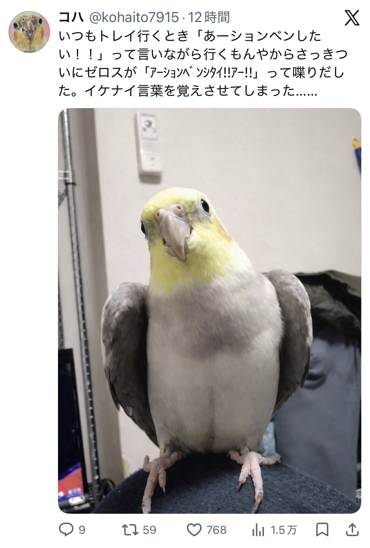| … | 6026/03/30(月)16:30:36No.1415740454+オカメのおしゃべりは聞き取りやすい発音じゃないから業者さんには気づかれてないと思いたい |