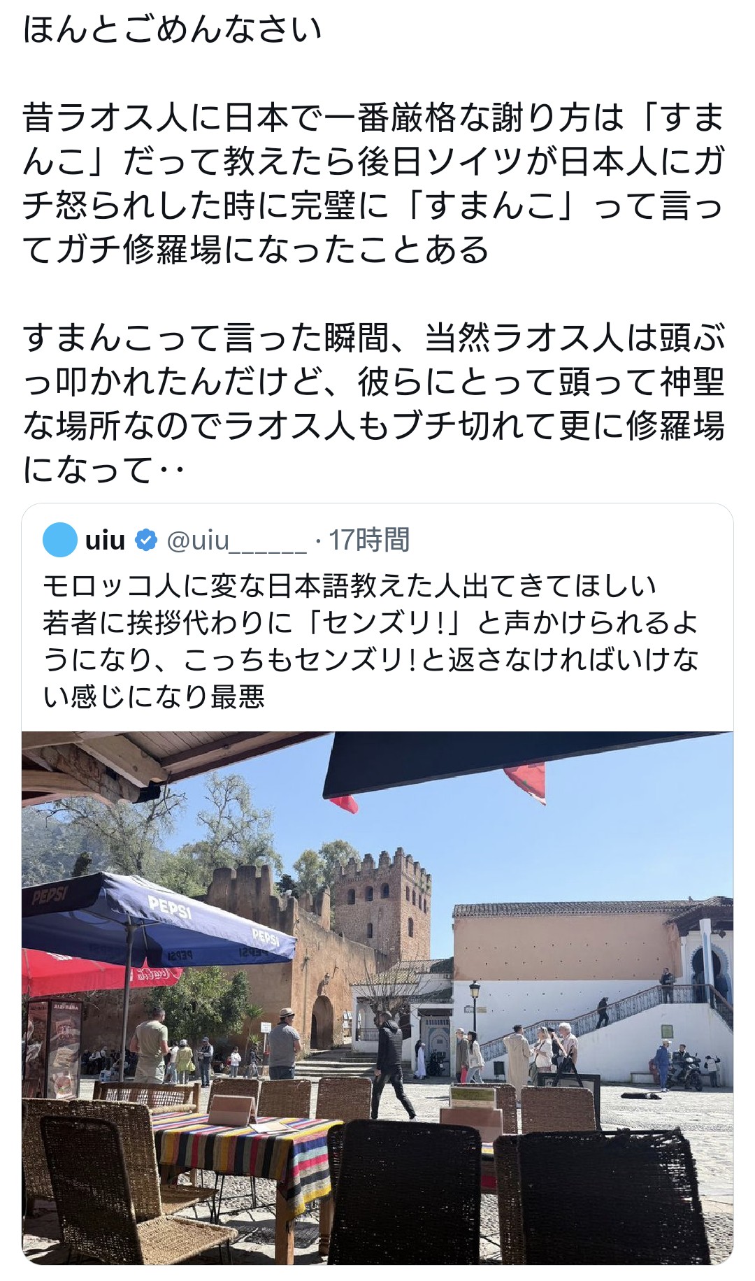 | … | 1526/03/30(月)15:51:44No.1415732940+ラオスの公用語わからんけど日本人とラオス人で会話してて怒られたのに謝る時だけ日本語はおかしいだろ |