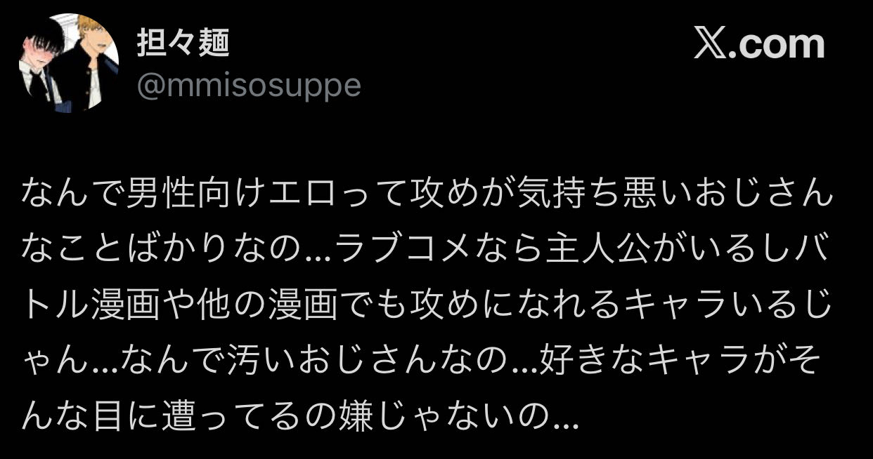 | … | 9026/03/30(月)19:39:54No.1415790178そうだねx8女が性欲の対象にして描いてるねっとりしたイケメン竿役のキモさはおっさんの比ではない |