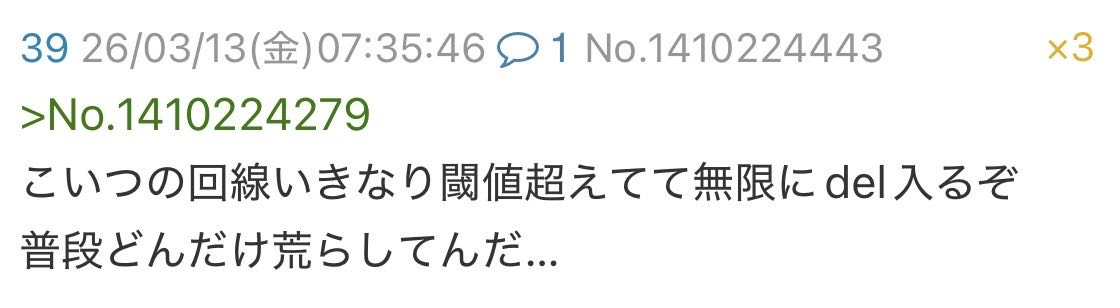 | … | 86026/03/30(月)21:17:56No.1415833646そうだねx2こんなスレが伸びてること |