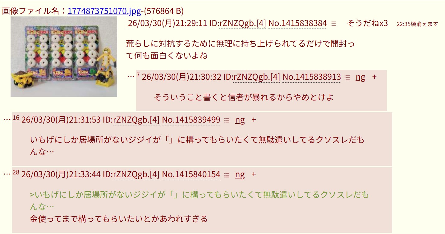 いもげにしか居場所がないジジイが「」に構ってもらいたくて無駄遣いしてるクソスレだもんな…