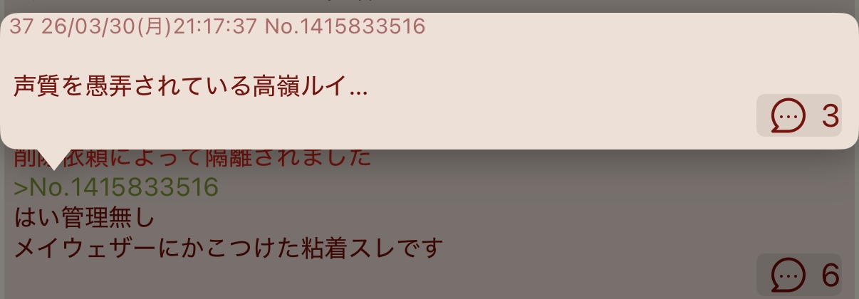 | … | 1026/03/30(月)22:19:16No.1415860101そうだねx3削除依頼によって隔離されました |