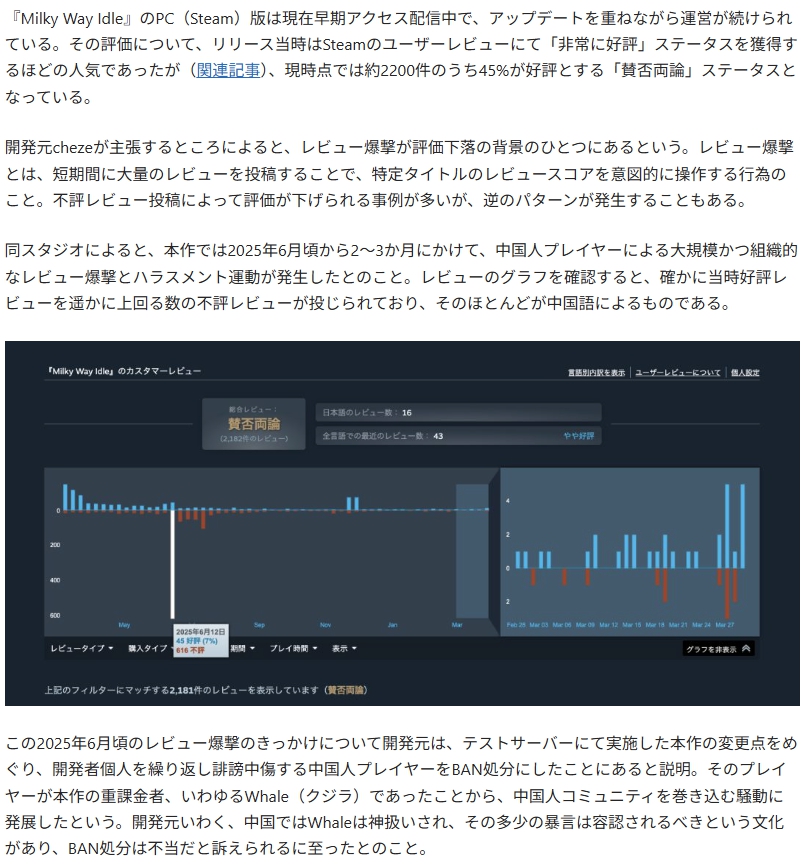 | … | 2726/03/31(火)05:24:31No.1415939331そうだねx9>この2025年6月頃のレビュー爆撃のきっかけについて開発元は、テストサーバーにて実施した本作の変更点をめぐり、開発者個人を繰り返し誹謗中傷する中国人プレイヤーをBAN処分にしたことにあると説明。そのプレイヤーが本作の重課金者、いわゆるWhale(クジラ)であったことから、中国人コミュニティを巻き込む騒動に発展したという。開発元いわく、中国ではWhaleは神扱いされ、その多少の暴言は容認されるべきという文化があり、BAN処分は不当だと訴えられるに至ったとのこと。 |