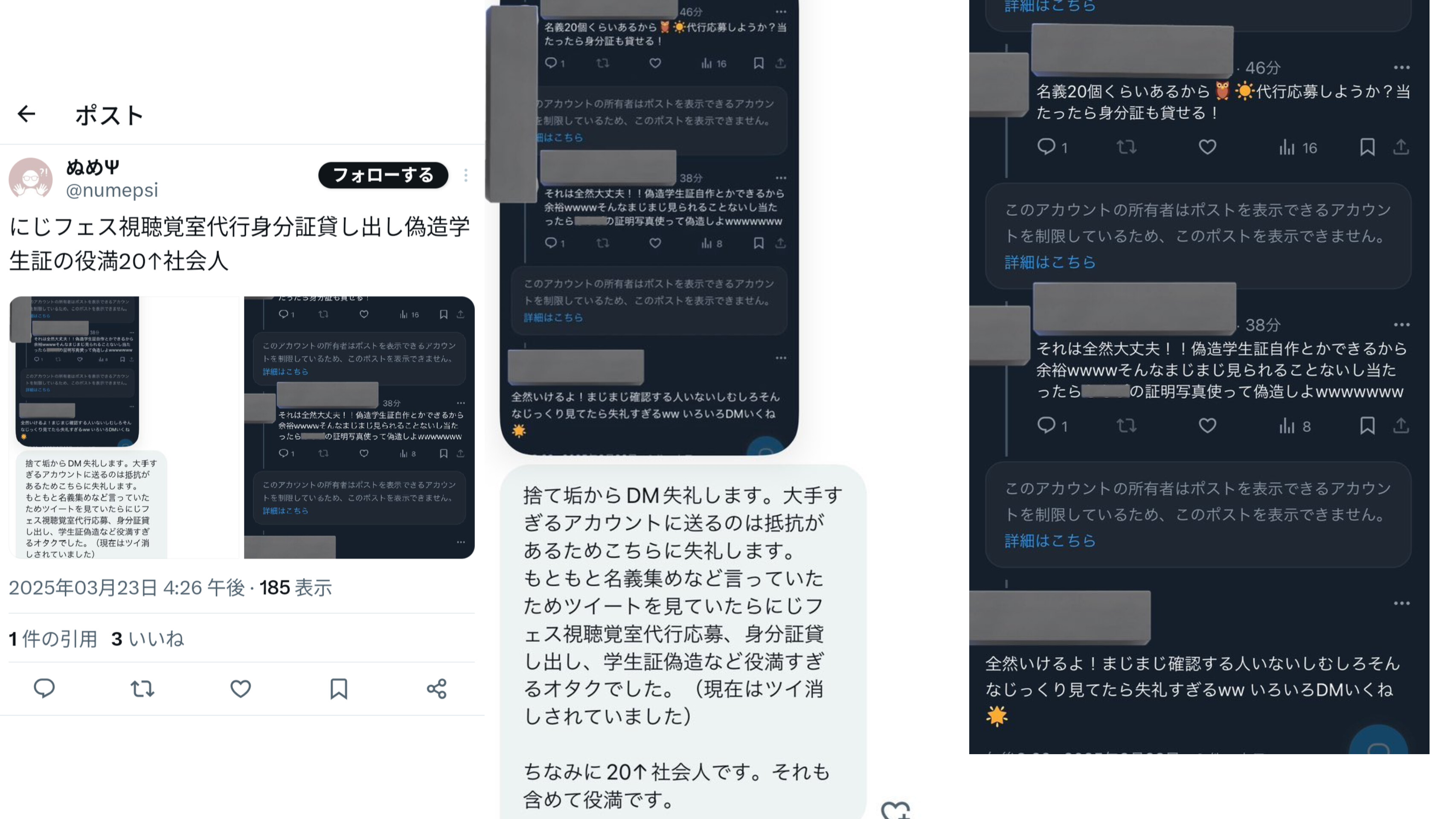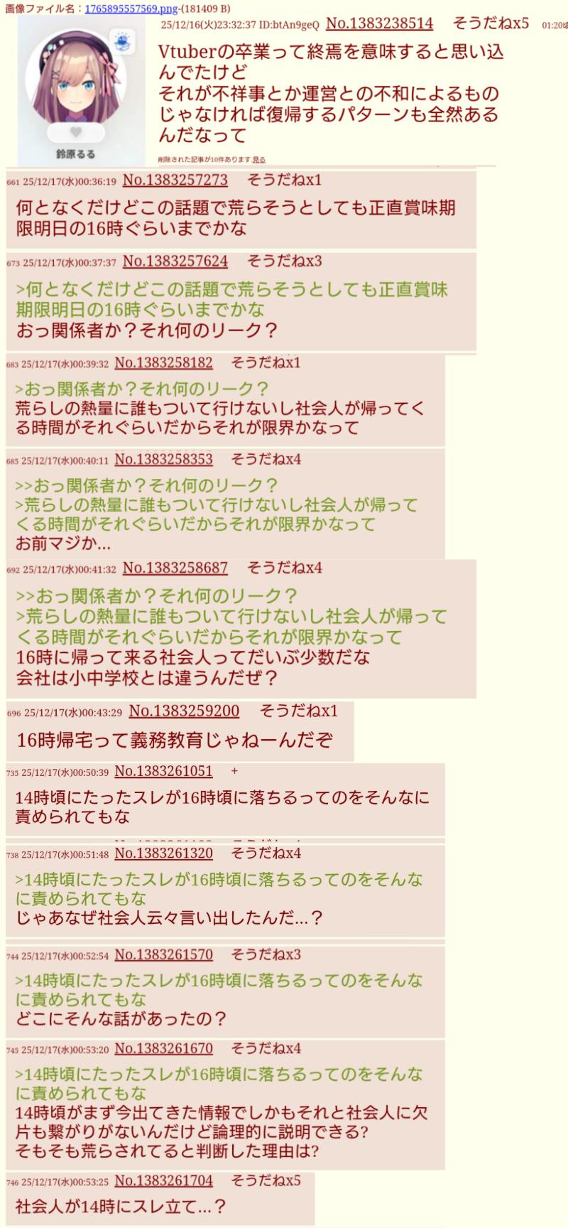 | … | 3826/03/31(火)09:17:22No.1415959527+>>そこで犯罪者のリスナーよりもババアか否かに食いつくからにじさんじリスナーはダメなんだ |
