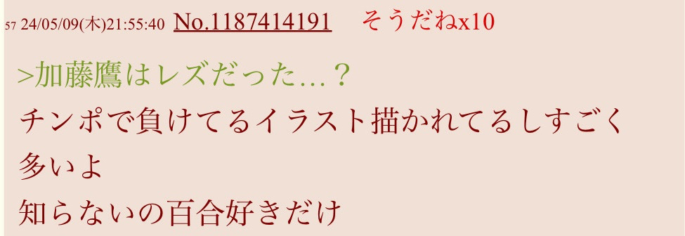 | … | 2026/03/31(火)12:19:08No.1415992604+>仮に知らない人物名だったとしても鷹って聞いて女性名とは普通思わなくない? |